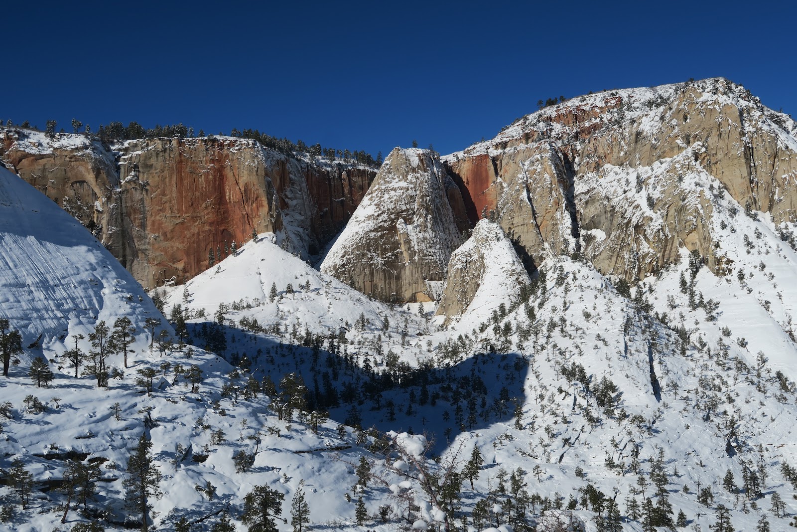 99% of people who go to Anegles Landing go back to trailhead after summitting, however, we as avid hikers, proceeded more on the West Rim trail. Last time we didn't do this, but this time we wanted to add some new sections. The entire West Rim trail is a multi-day backpacking thing, but this time we just hiked around a couple of miles to get taste. Below picture is one of the best view on the West Rim trail. It is really beautiful! I like the interesting triangle cone shape rock in the middle of picture. Such magnificent rock formations with pure white snow is truly an amazing view.